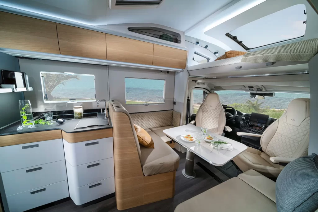 Il salone offre spazio e un’ampia dinette con comode sedute, fino a sette posti omologati e opzione Isofix.