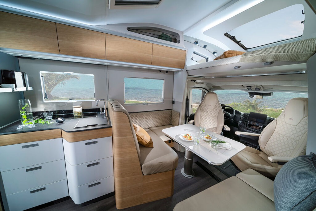 Il salone offre spazio e un’ampia dinette con comode sedute, fino a sette posti omologati e opzione Isofix.