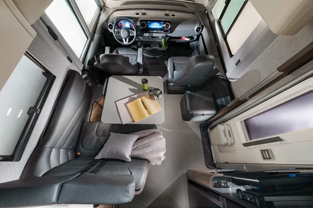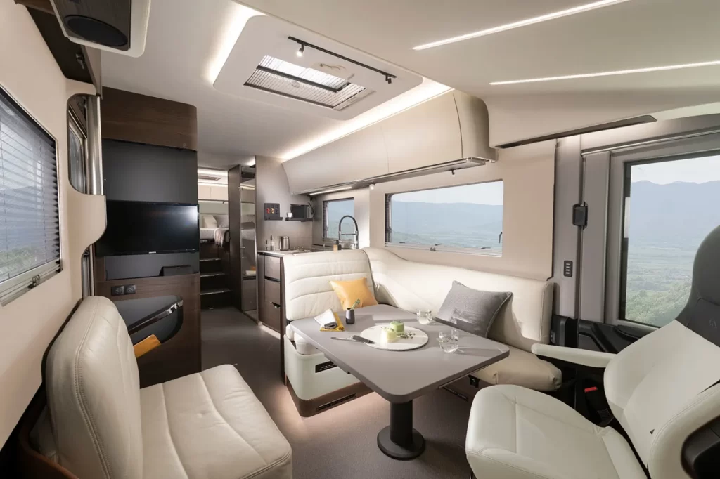 Zona dinette dal design moderno in stile open space, con parete divisoria ribassata e dinette a L o face-to-face (a seconda dei modelli), dotate di cuscini confortevoli e rivestiti con materiali di qualità.