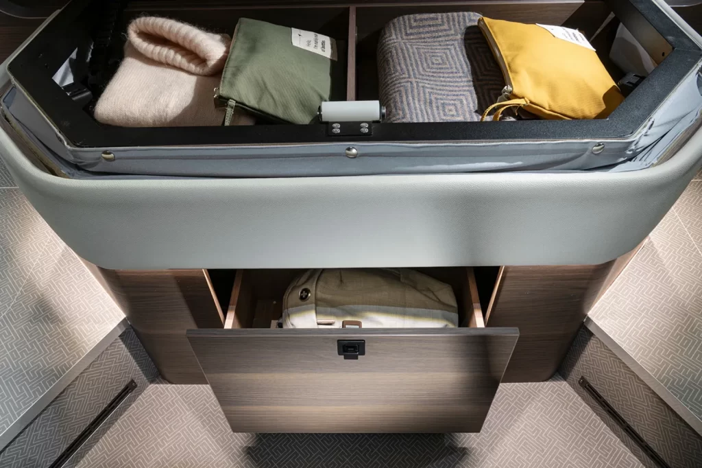 Elegante camera da letto posteriore dotata di letto centrale king-size regolabile elettricamente (1.500 x 1.950 mm) o letti gemelli (2.050 x 830 mm), tutti dotati di rete a doghe e materassi Luxe.