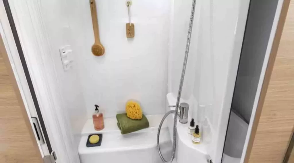 Accessori integrati: portasapone, portabicchiere, portasciugamani.
