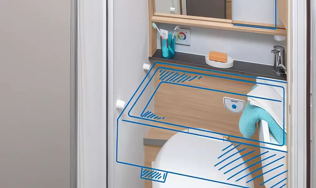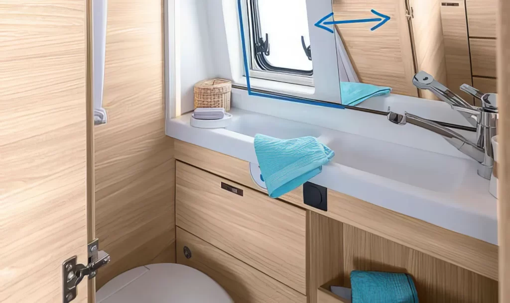 Specchio scorrevole, numerosi ripiani e innovativo lavabo estendibile che aumenta le dimensioni in un solo gesto.