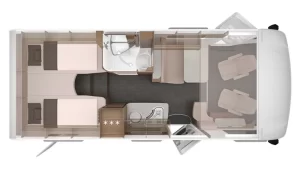 Suggestiva illuminazione d’ambiente Ampi letti singoli nella zona posteriore Letto basculante di serie nella zona anteriore Frigorifero XL con 142 litri di capacità Bagno a volume variabile con parete doccia girevole Fantastica sensazione di spazio e benessere