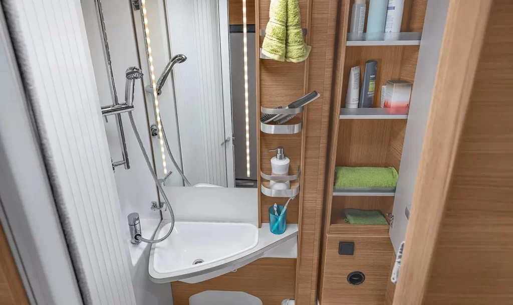 Avere il proprio bagno in viaggio è un’autentica comodità. Poterlo portare ovunque è un vero lusso. Soprattutto quando è allestito in modo ottimale come qui con il mobiletto extra large.