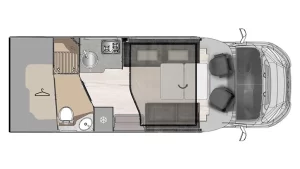 MC4 321 profilato con letto basculante. Ampia dinette face to face, grande frigorifero da 145l. Bagno posteriore e armadio in coda.