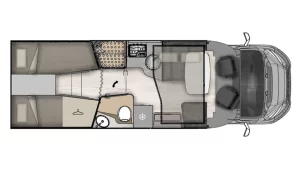 MC4 373 profilato con letto basculante di 7,45 metri con letti gemelli posteriori e salone con tavolo centrale.