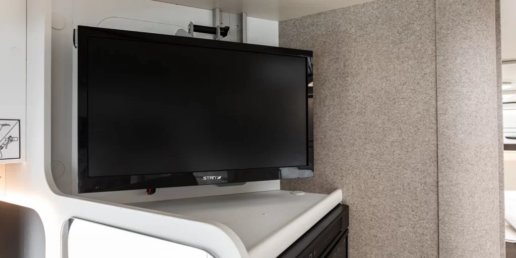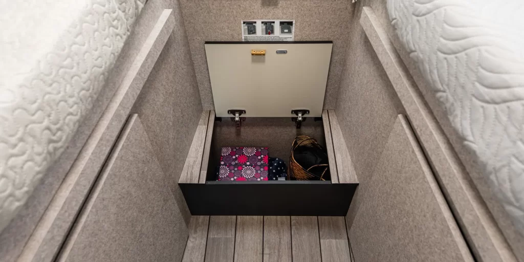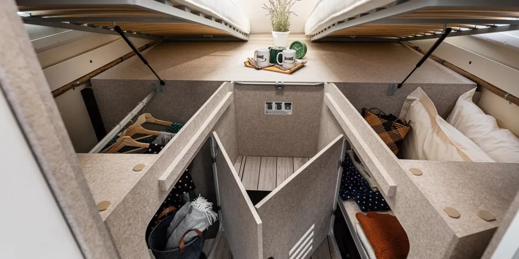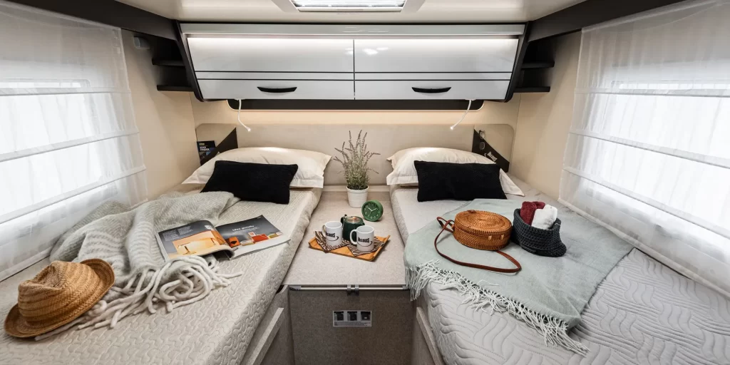 Profilato con letto basculante di 7,45 metri di lunghezza · Letti gemelli trasformabili in maxi