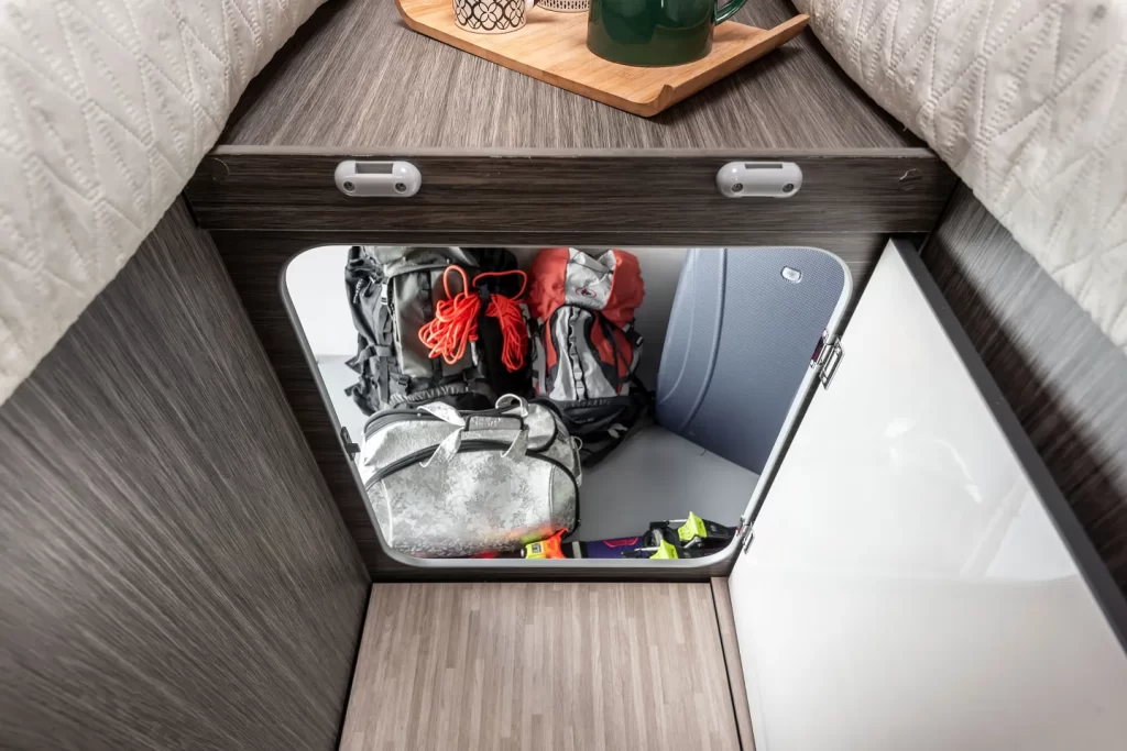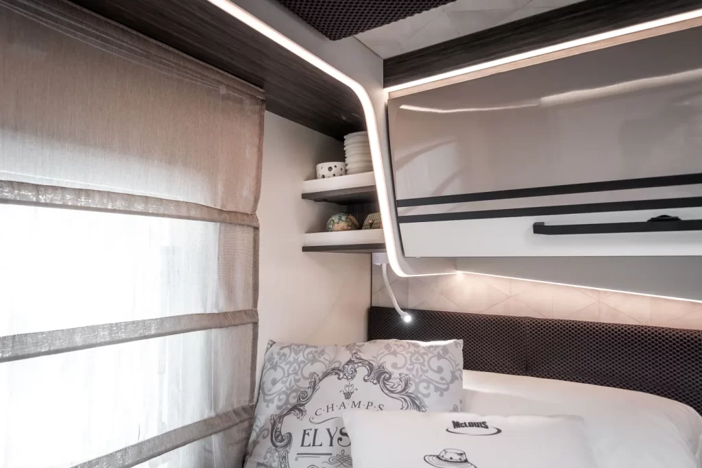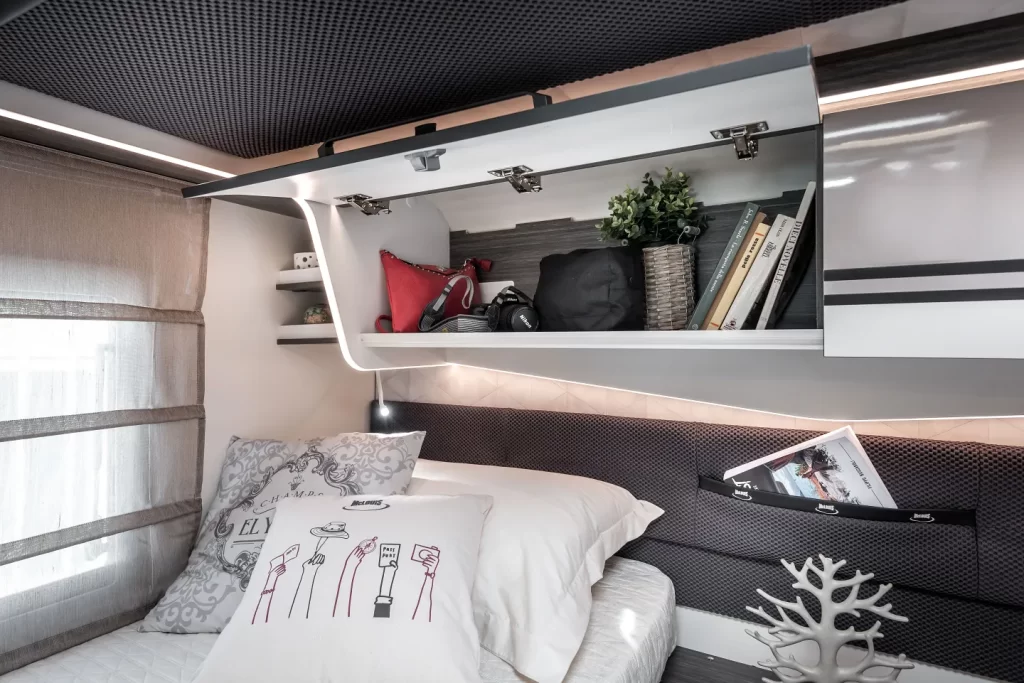 MC4 865 profilato con letto basculante sotto i 7 metri con letti gemelli in coda. Uno dei 2 letti di ben 2 metri di lunghezza.