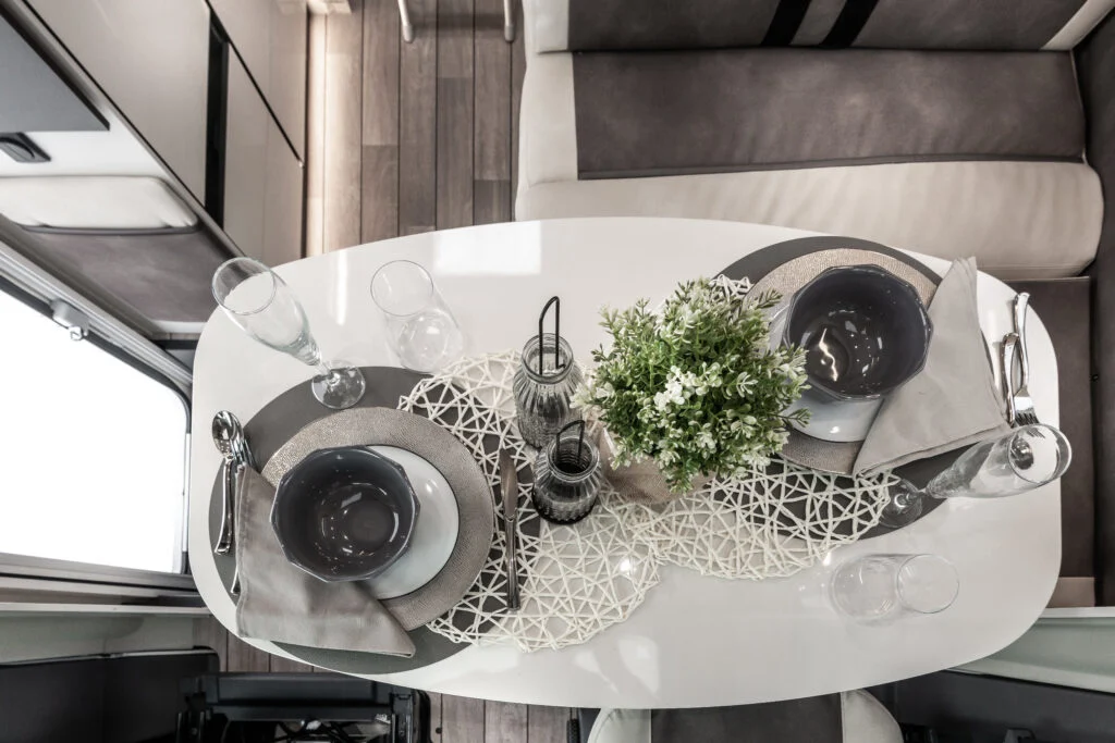 PROFILATO SOTTO I 6 METRI DALLE DIMENSIONI COMPATTE, CON DINETTE A L E LETTO MATRIMONIALE TRASVERSALE.