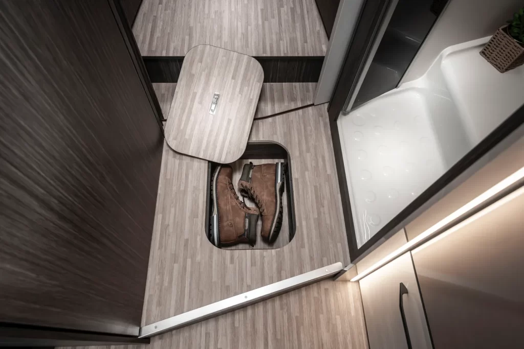 – Spessore del pavimento: 54 mm – Spessore del soffitto e delle pareti: 30 mm – Tetto esterno in vetroresina – Pareti interne/esterne in vetroresina – Area inferiore del telaio rivestito in vetroresina”
