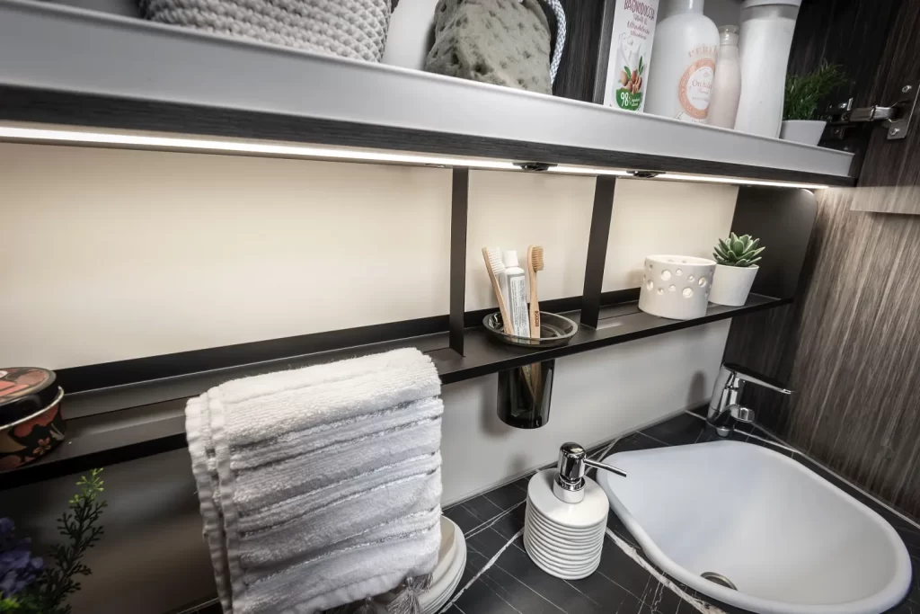 Supporto per oggetti visibili lungo tutta la lunghezza del bagno