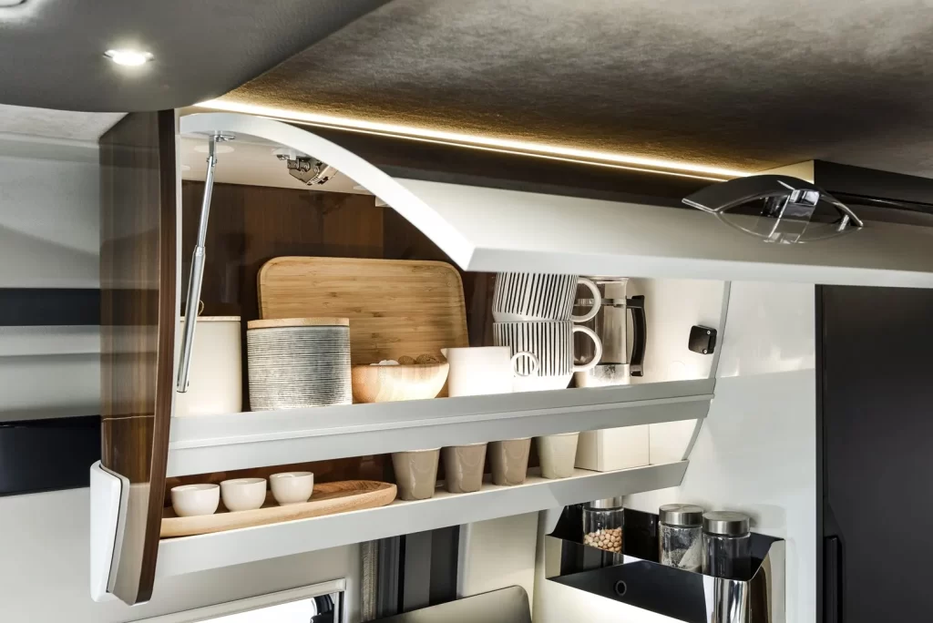 Sedili sagomati con poggia testa regolabili. Pensili con illuminazione interna automatica all’apertura.