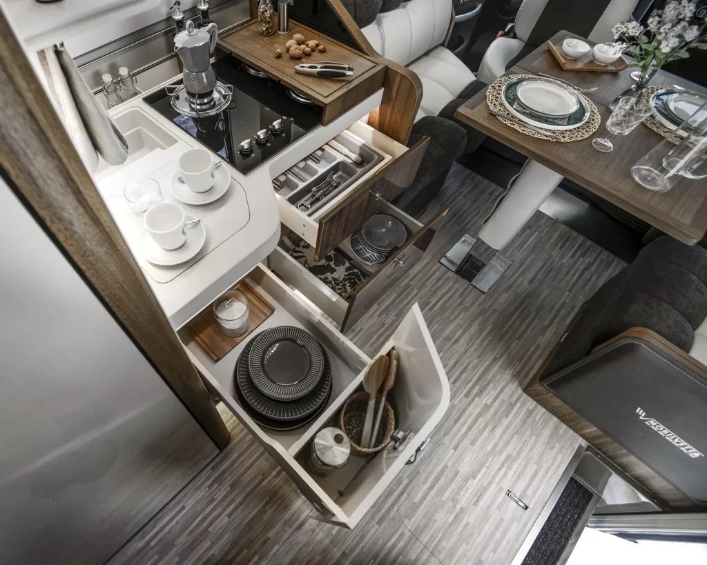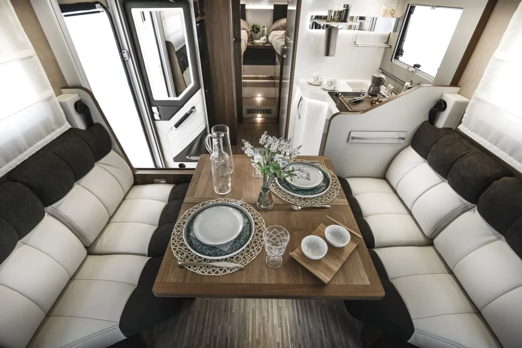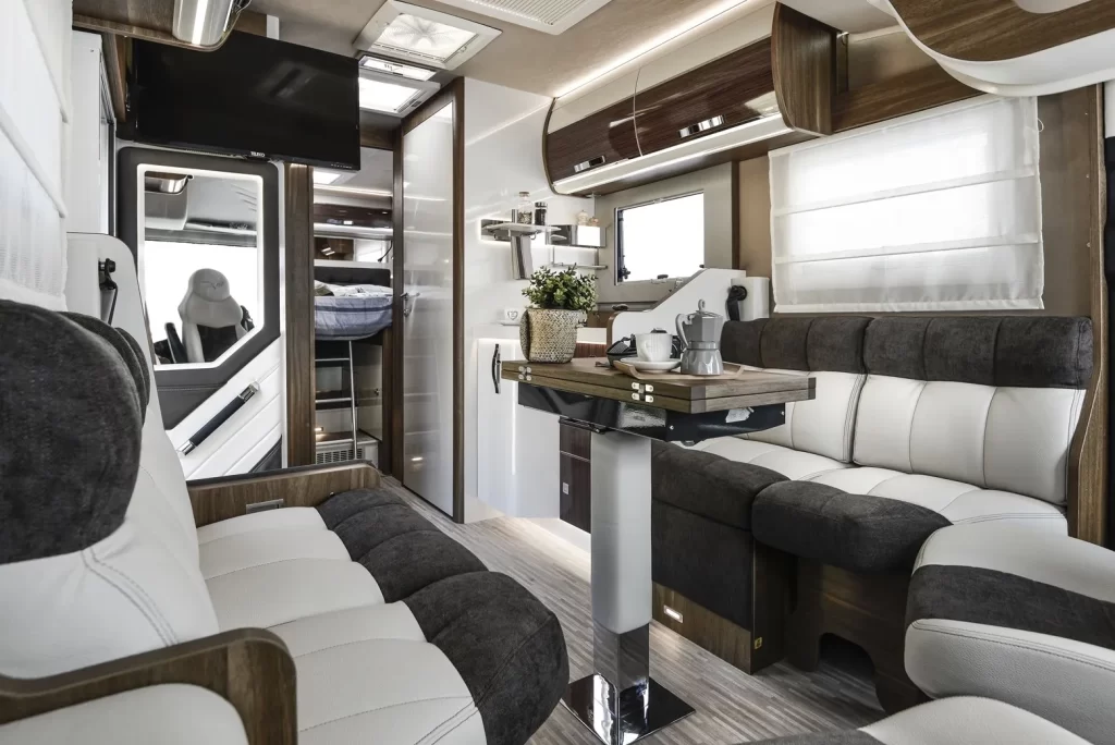 K-Yacht Tekno Line 86 motorhome con maxi letti gemelli, ambienti separati e un grande soggiorno face to face.