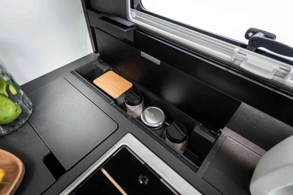 Forma a L con apertura verso la zona living per ancora più spazio vivibile.: 1 cassettone scorrevole, 1 cestello, 1 cassetto, con portaposate, 1 sportello, 1 pensile.