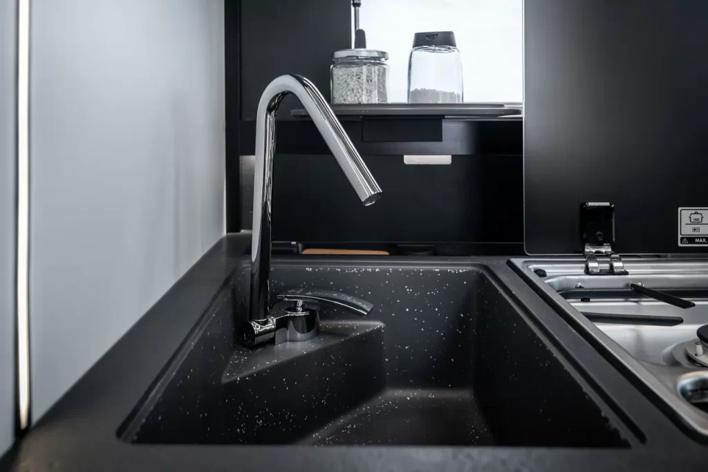 Cucina effetto “sospeso”, per avvicinarsi il più possibile al piano di lavoro.