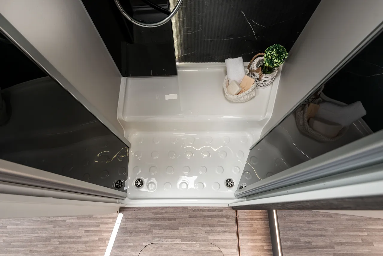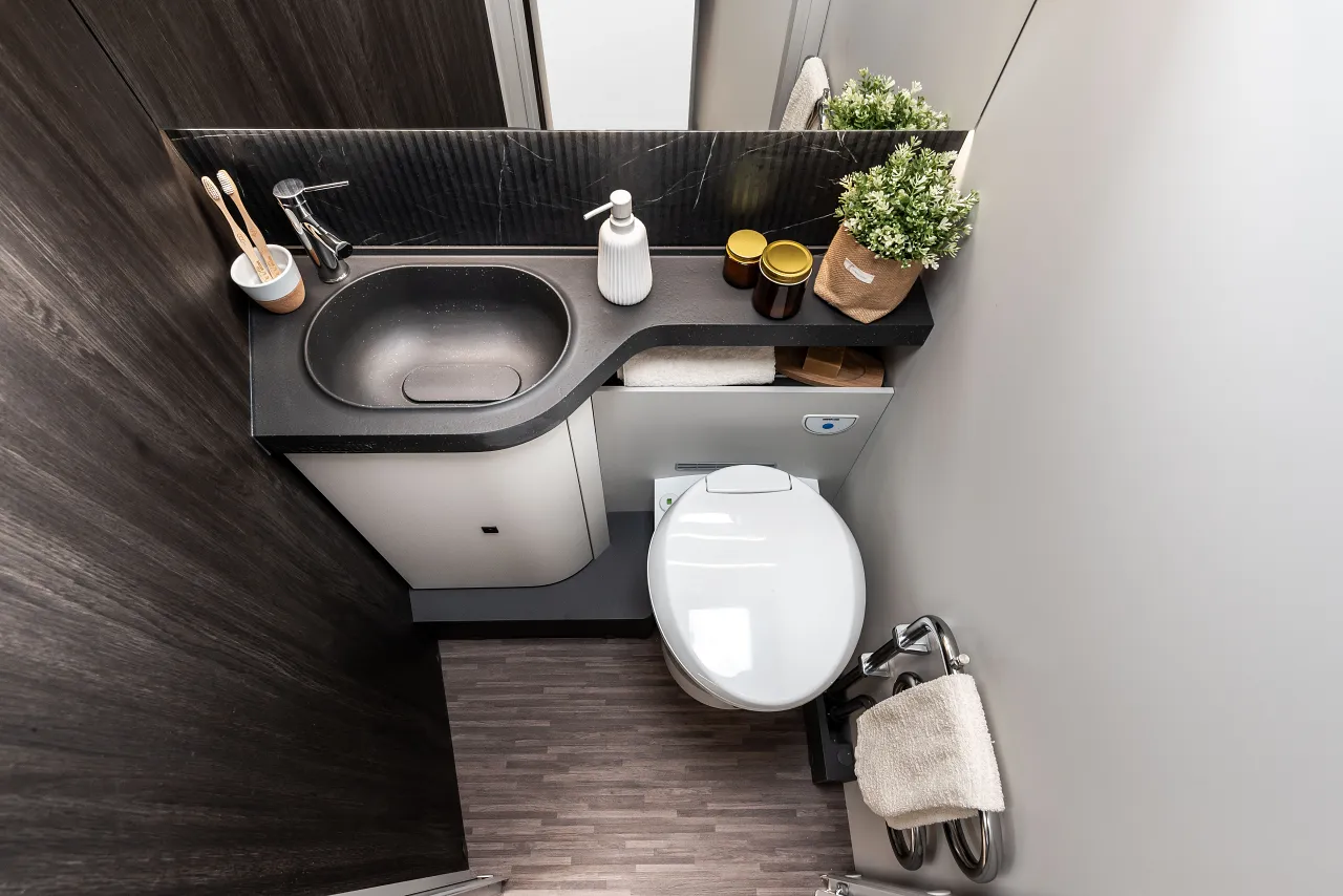 Toilette e doccia separati: utilizzabili contemporaneamente. Igiene: piano in laminato opaco antibatterico.