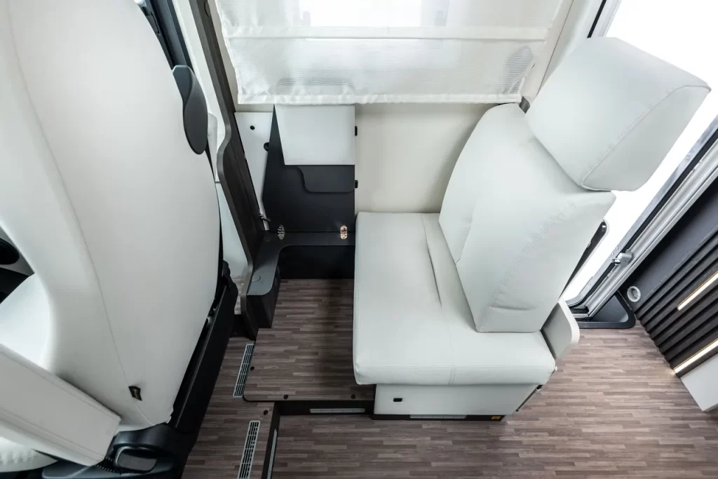 I sedili cabina, si ruotano per integrarsi in un salotto. Ampliata la seduta del divano laterale.
