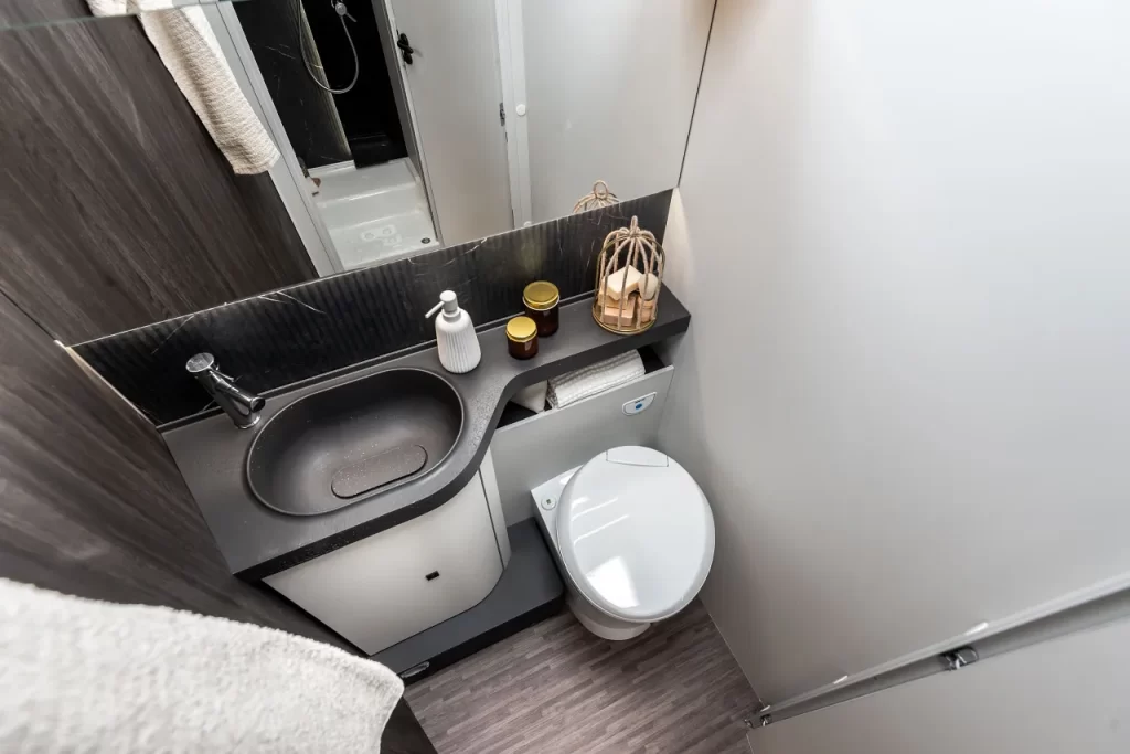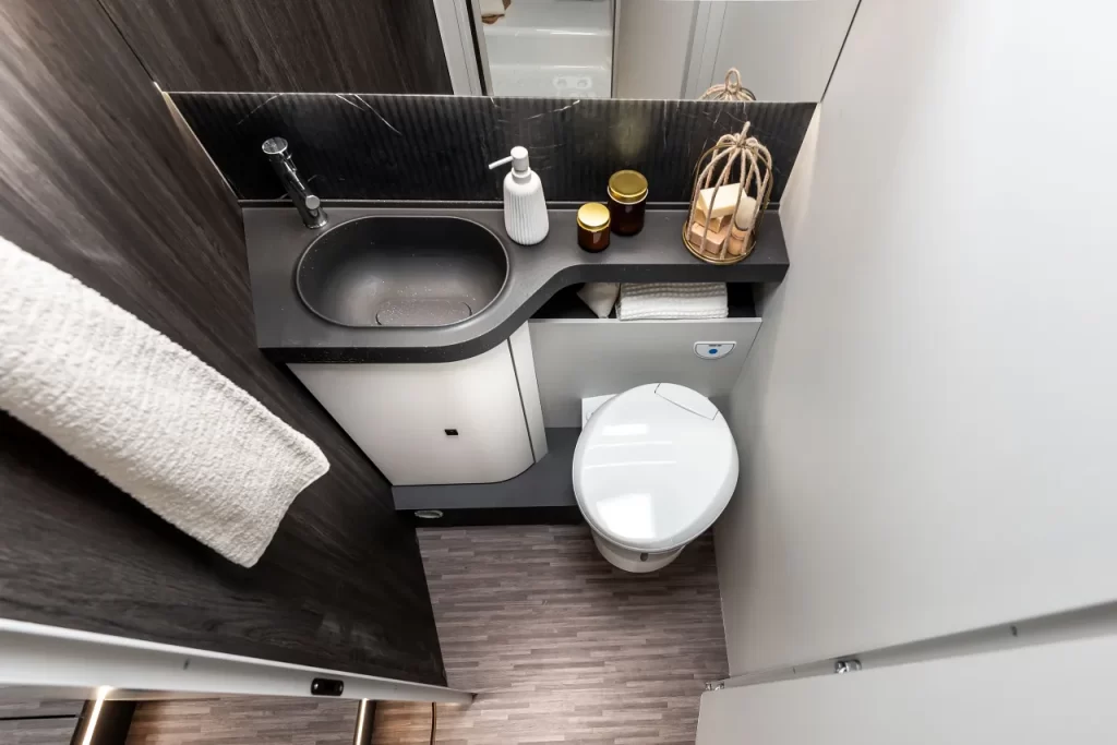 Toilette e doccia separati: utilizzabili contemporaneamente. Igiene: piano in laminato opaco antibatterico.