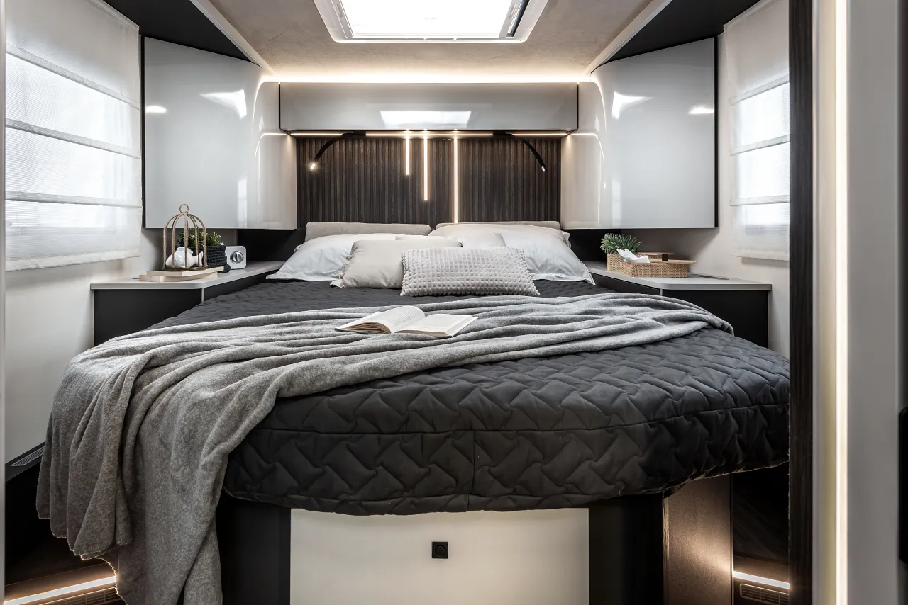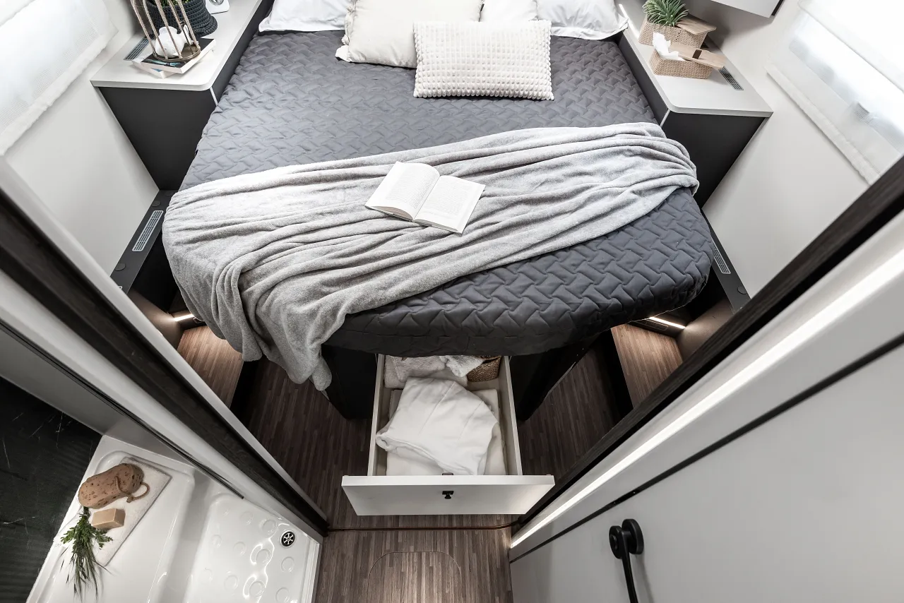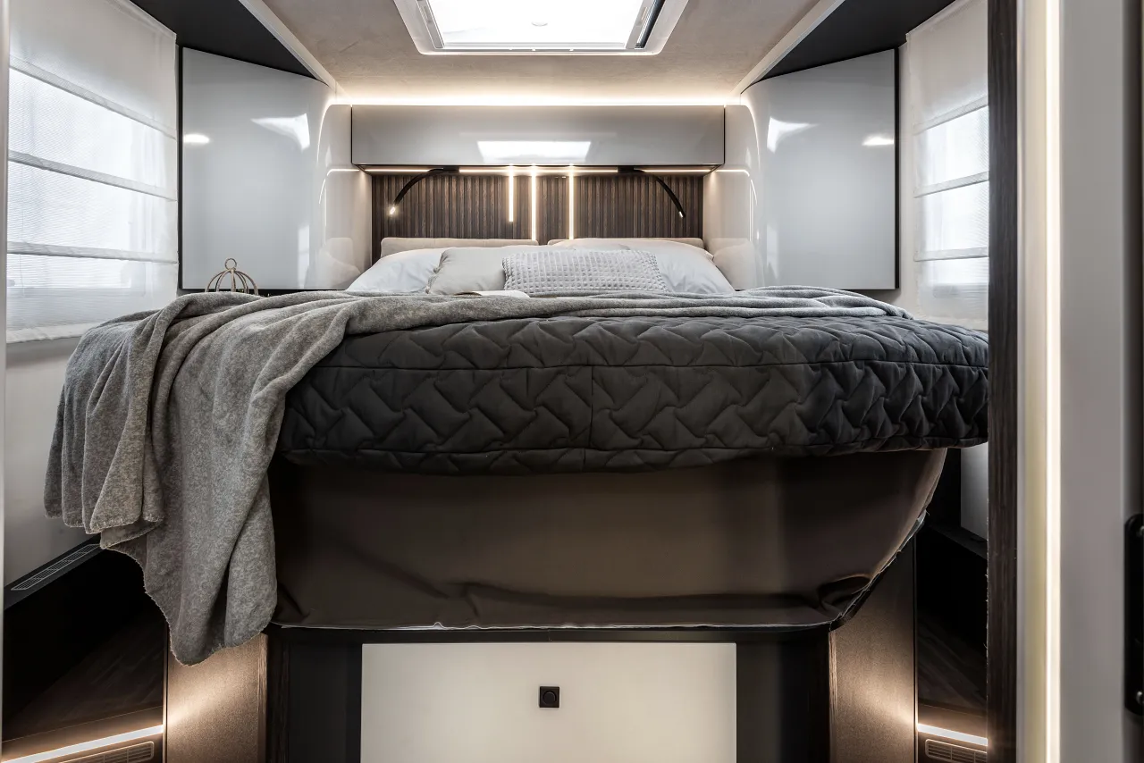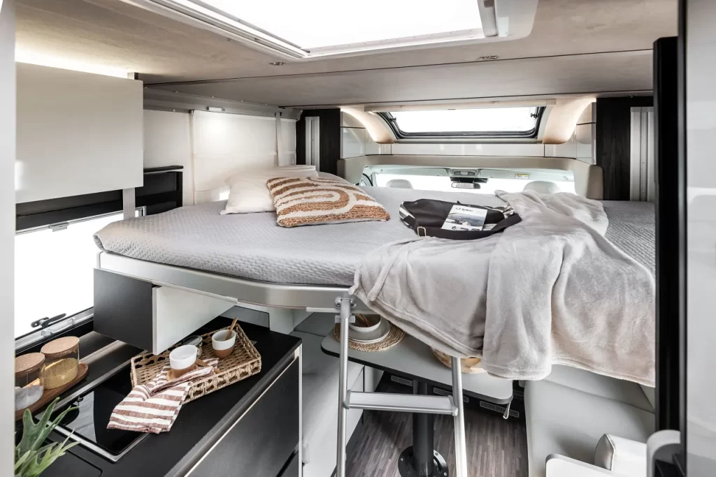 Dimensioni maxi. Variante con il letto più basso per un accesso ancor più agevole non rinunciando comunque a spazio disponibile per il carico nel gavone sottostante.