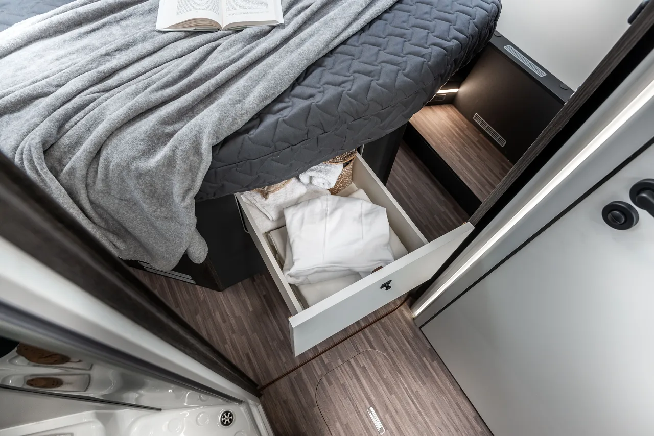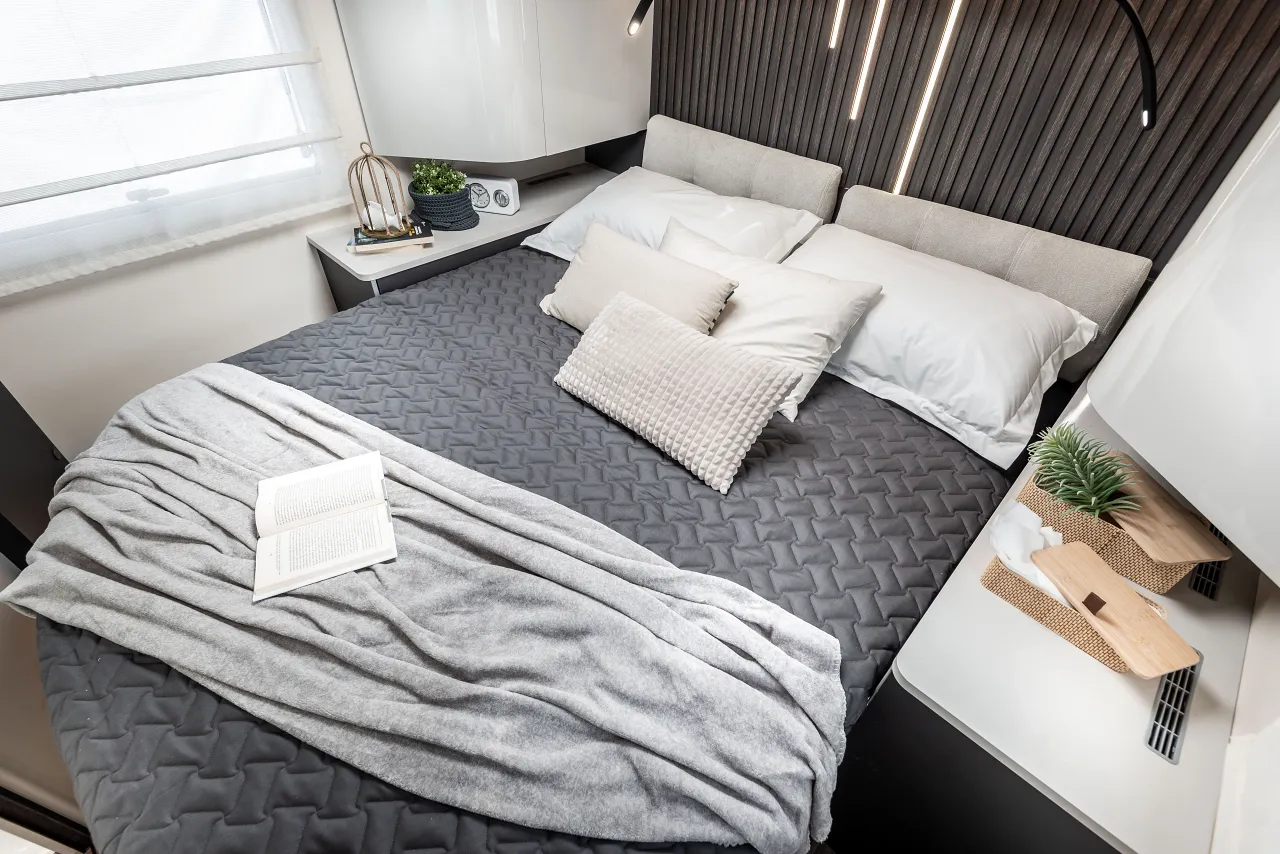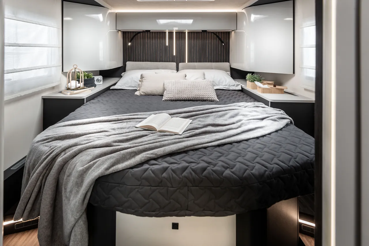 Dimensioni maxi. Variante con il letto più basso per un accesso ancor più agevole non rinunciando comunque a spazio disponibile per il carico nel gavone sottostante.