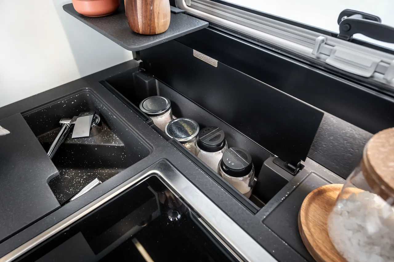 Forma a L con apertura verso la zona living per ancora più spazio vivibile.: 1 cassettone scorrevole, 1 cestello, 1 cassetto, con portaposate, 1 sportello, 1 pensile.