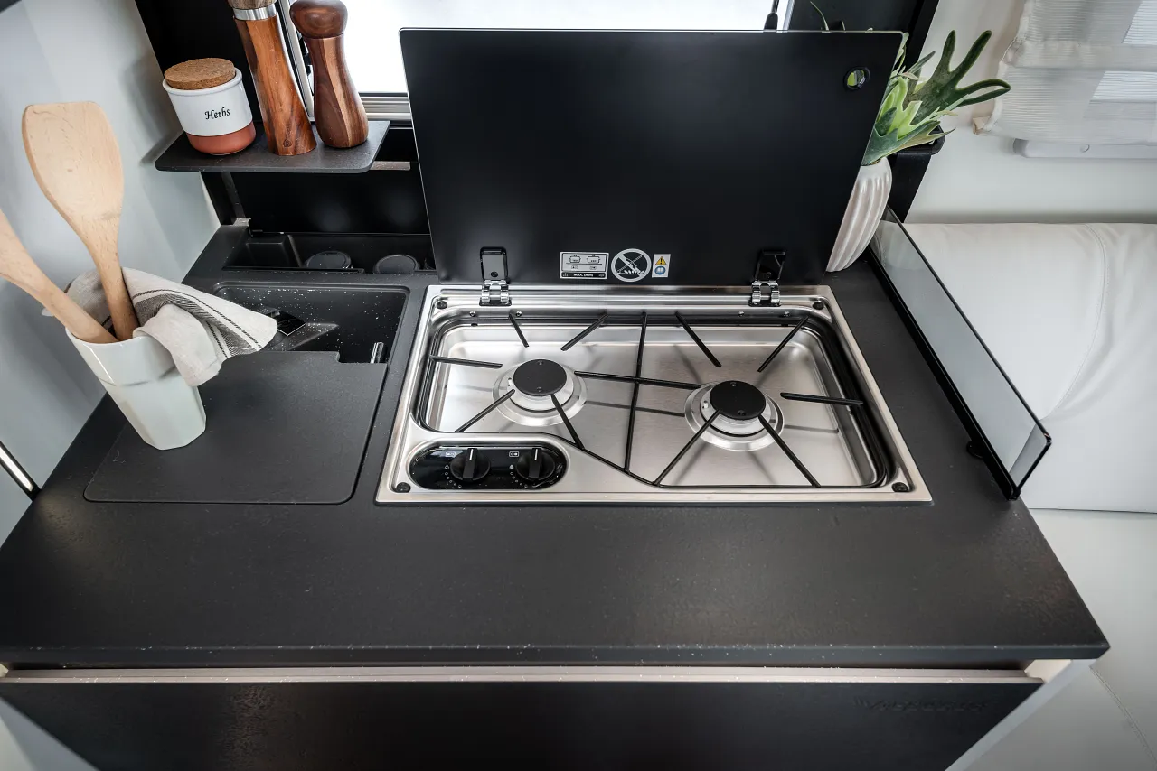 Facile da pulire: piano in laminato antigraffio. Piano cottura in acciaio inox, 3 fuochi, porta rotolo e porta asciughino.
