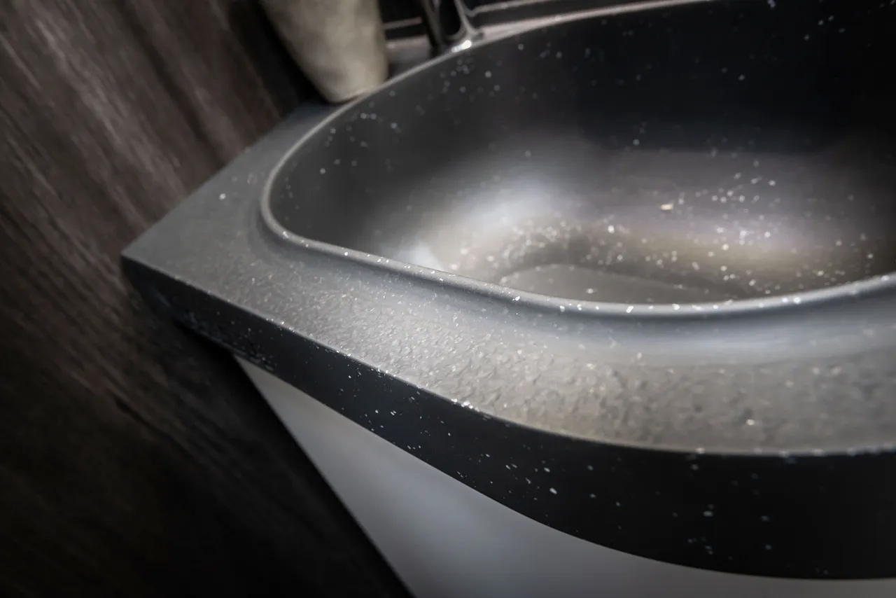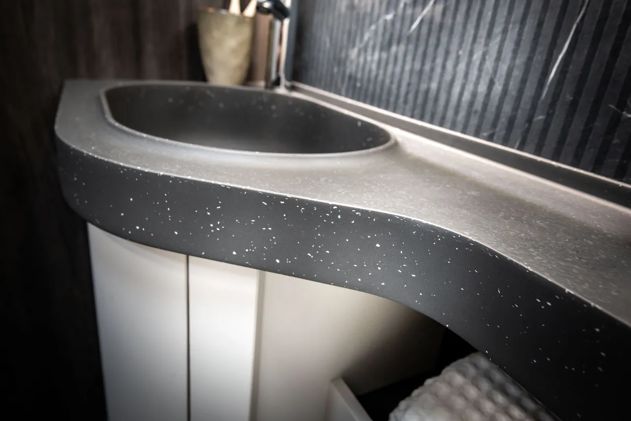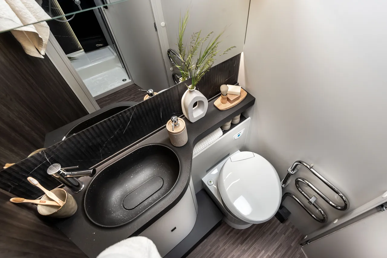 Toilette e doccia separati: utilizzabili contemporaneamente. Igiene: piano in laminato opaco antibatterico.