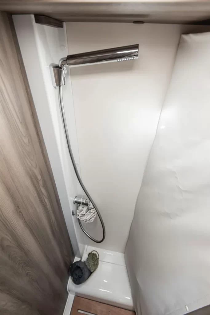 Carrozzeria EXPS: Massima impermeabilità e isolamento acustico della cabina. Pareti interne e pavimento con materiale plastico resistente all’acqua – Spessore del pavimento: 54 mm – Spessore del soffitto e delle pareti: 30 mm – Tetto esterno in vetroresina – Pareti interne/esterne in vetroresina – Area inferiore del telaio rivestito in vetroresina